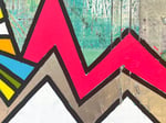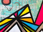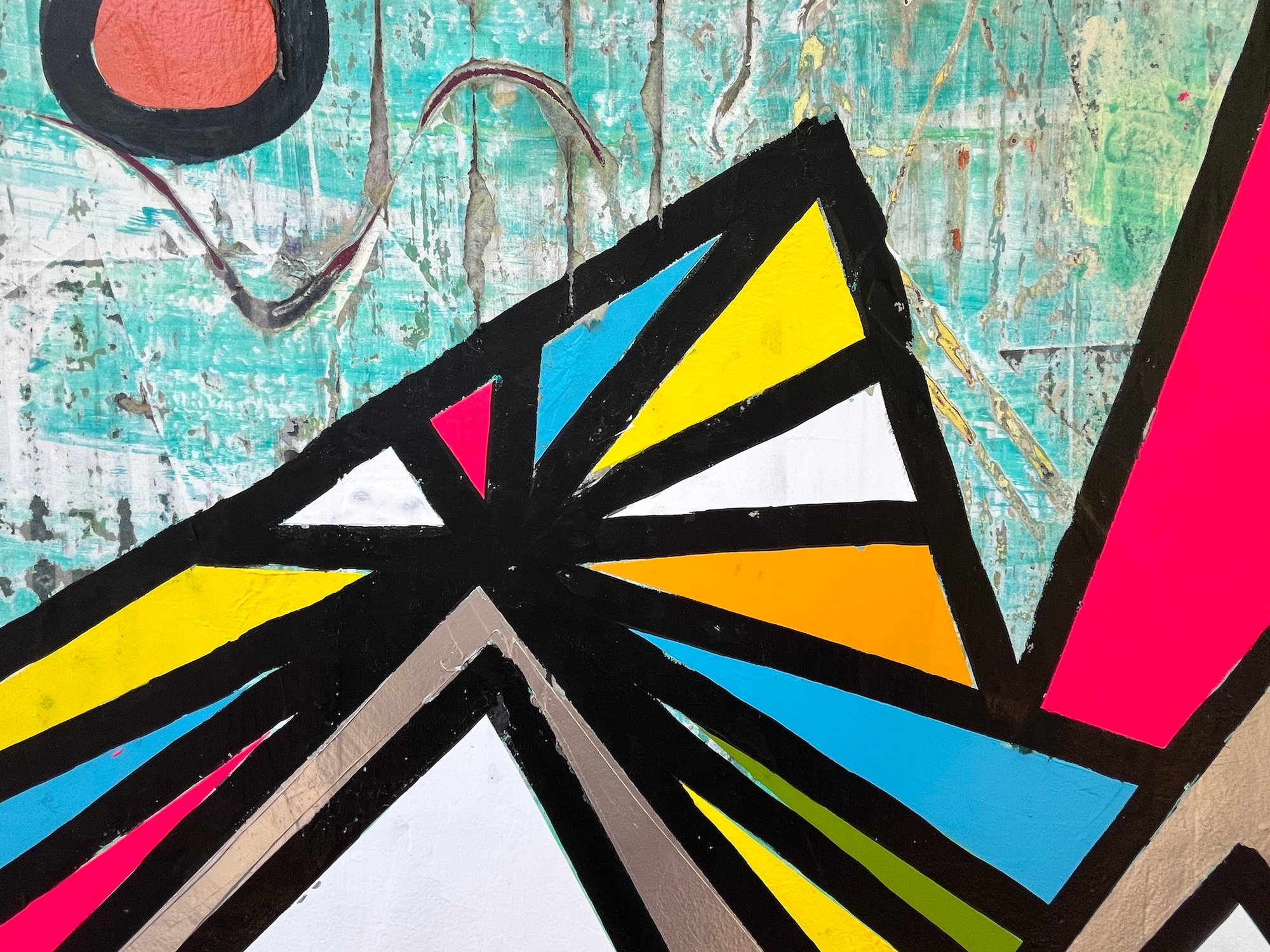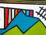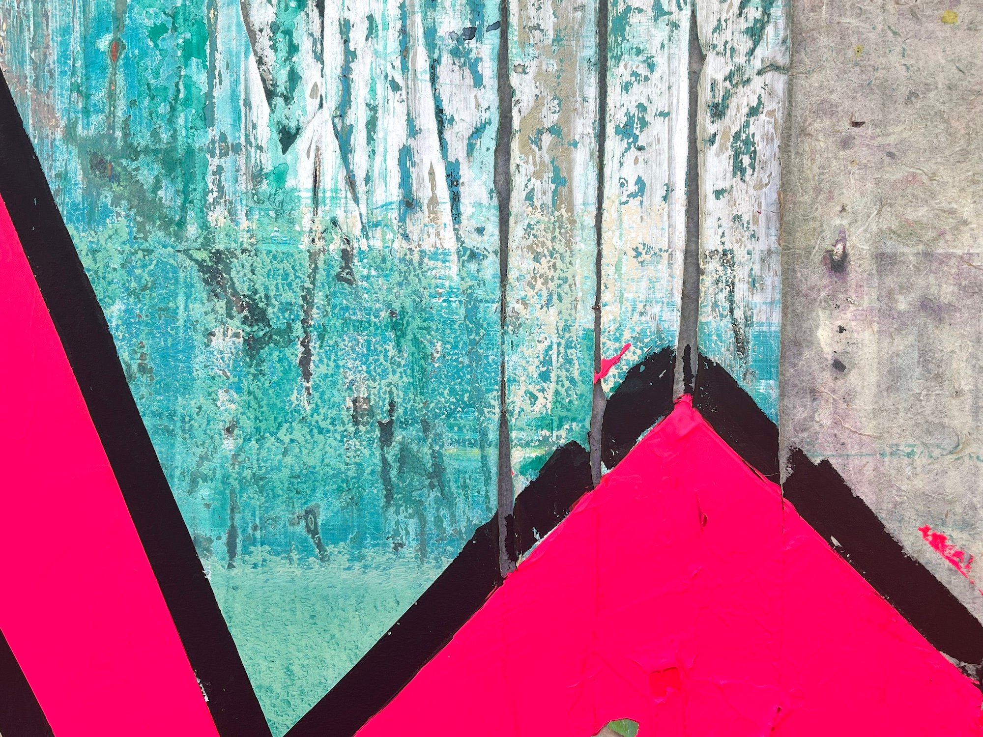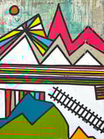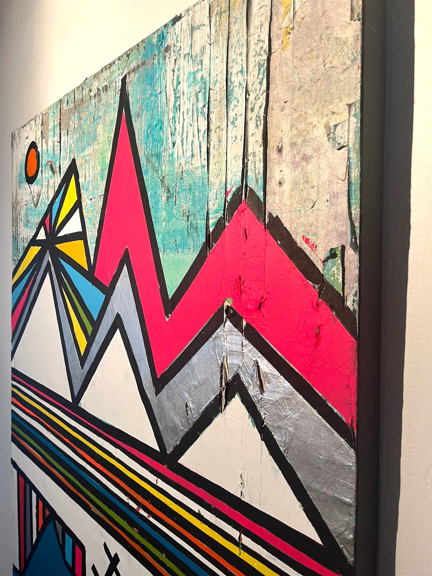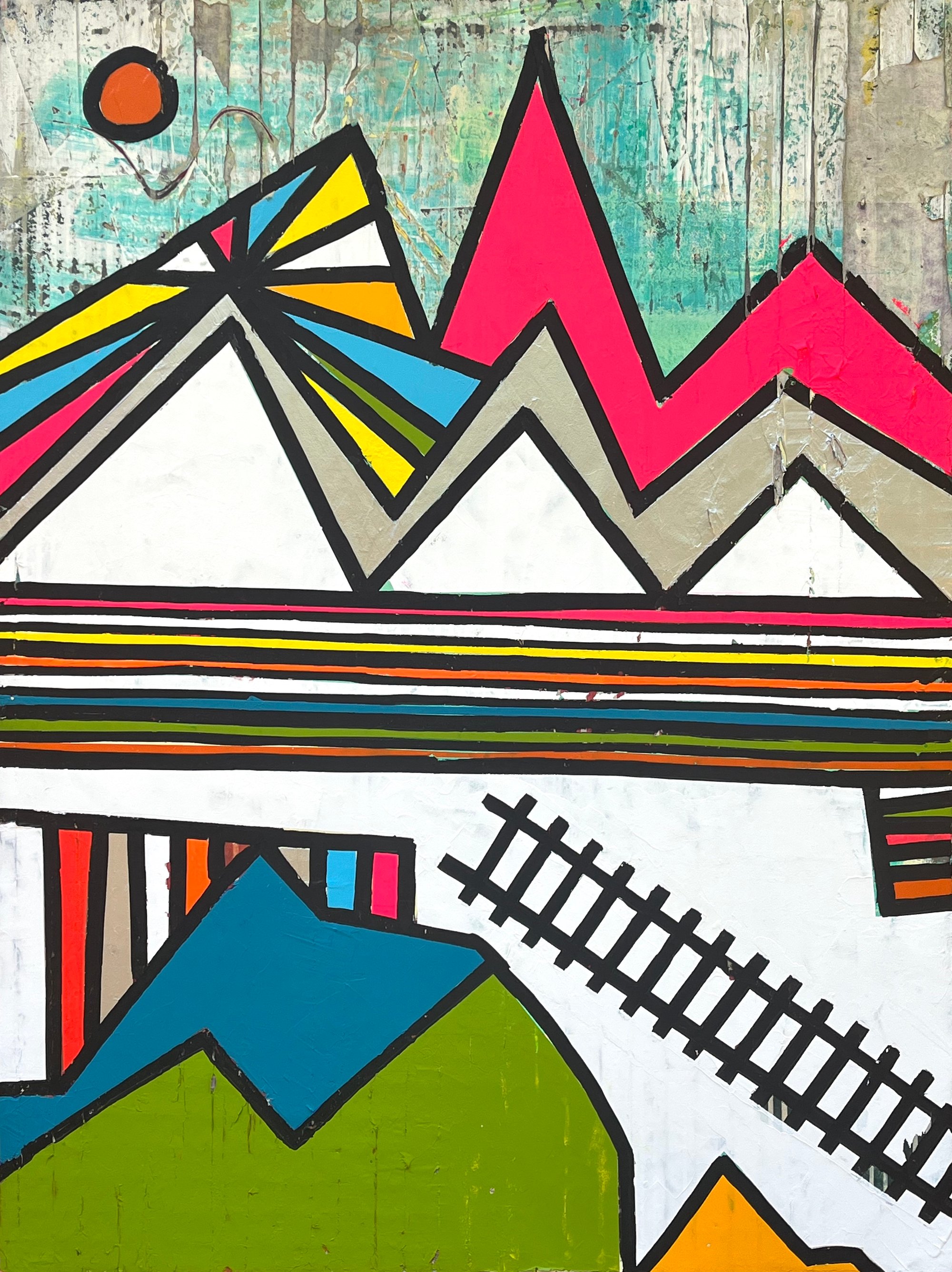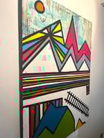 Original one of a kind hand created mixed media artwork on 36x 48x 1.5" gallery wrapped canvas. Layers of specialty papers gave way to marker and acrylic mountain sketches. Areas of distressed paper and thick paints add a slight vintage feel to the artwork.